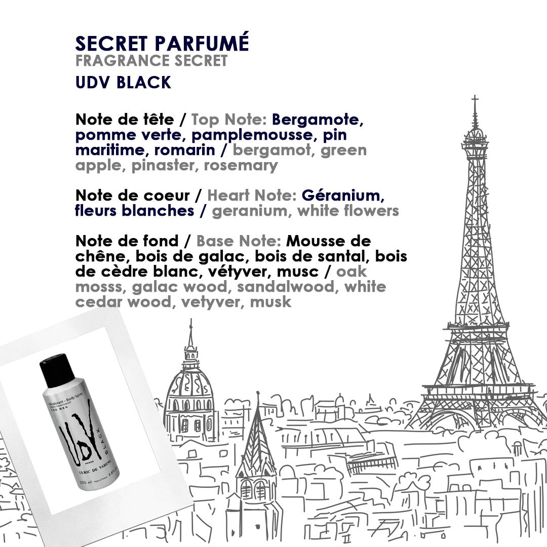 UDV BLACK for Men ist eine frische Komposition aus Bergamotte, grünem Apfel und Grapefruit und betört in der Herznote mit einer süßen Mischung aus Geranie und weißen Blumen, abgerundet mit würzigen Noten aus Zedernholz und Eichenmoos.